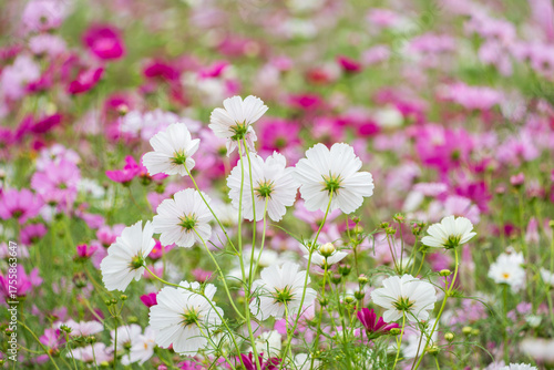 © Kazutaka, Obraz premium カラフルなコスモス畑を背景に可憐に咲き誇る白いコスモス