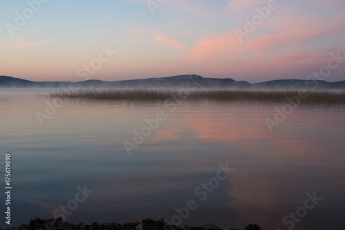 © papava, Fototapeta premium Туманный, ранний, розовый рассвет на озере с горами на заднем плане.