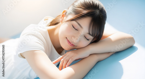© k-studio, Fototapeta premium 爽やかな水色背景の下で微笑む女性のポートレート