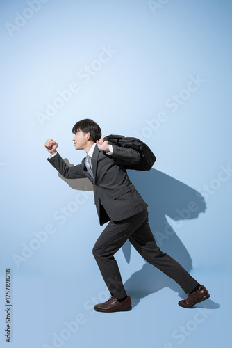 Obraz premium 通勤カバンを持つ走るポーズのスタートのような20代の新卒や就活、リクルートのイメージ全身横顔