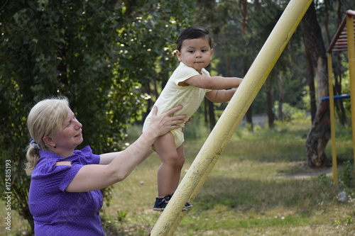 © sashasandro, Obraz premium женщина на спортивной площадке с ребенком