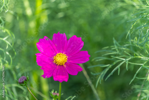 © Kazutaka, Obraz premium 緑の背景に咲く一輪の美しいピンク色のコスモスの花