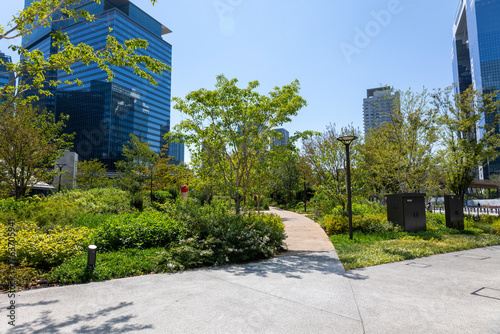 © decoplus, Fototapeta premium 青空と高層ビルとグラングリーン大阪(2025年8月撮影)