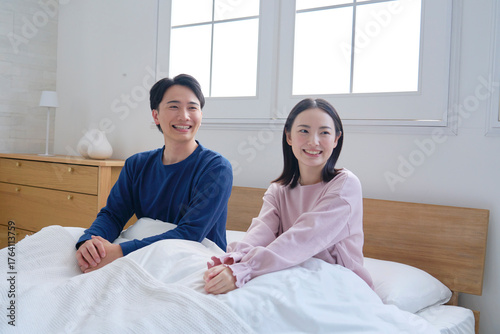 Fototapeta premium 起床したベッドの上の夫婦のポートレート カメラ目線
