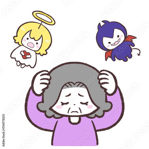 © おひさまストック, Obraz premium 悪魔と天使の言葉に頭を抱えるシニア女性のイラスト