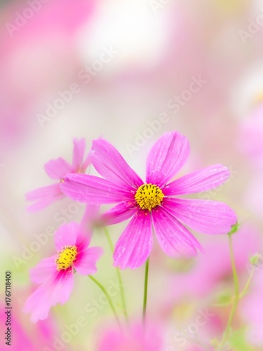 © STOCK THE WORLD, Obraz premium 華やかな花壇の中でより目立っている鮮やかなピンクのコスモスのポートレート。やわらかくボケた背景。秋を彩るコスモスの花畑。自然風景。縦構図
