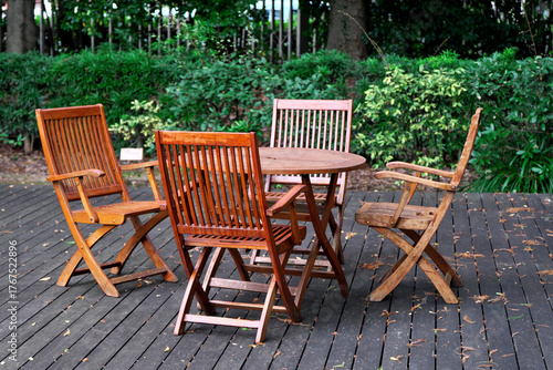 © taka, Obraz premium 新緑に囲まれたウッドデッキのガーデンファニチャー:木製テーブルと椅子のあるテラスの休憩空間。アウトドアリビング、リゾート、カフェ、自然の中でのリラックスタイムを伝えるイメージ素材。