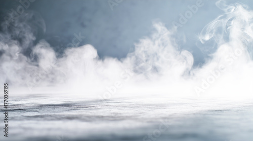 © izzyU, Fototapeta premium 水面に漂う白い煙と霧が広がる冷たく静かな背景