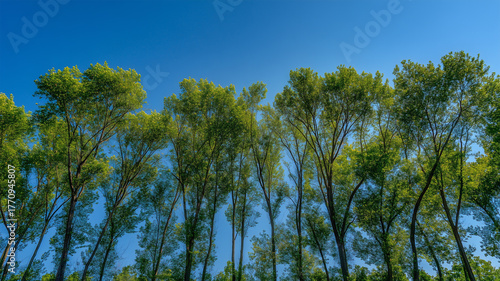 Obraz premium 空へ伸びる緑の並木と真夏の青空