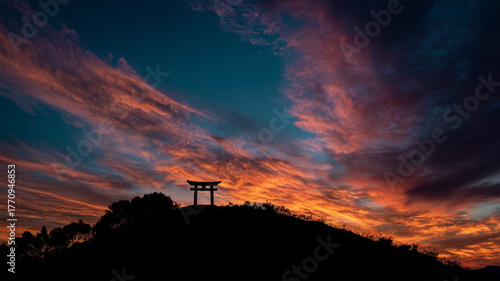 © bephoto, Fototapeta premium 夕焼けと青空のグラデーションに浮かぶ鳥居