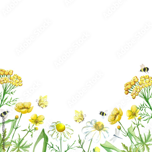 Obraz premium Акварельная рамка с цветами и насекомыми на белом фоне. Подходит для открыток, приглашений, этикеток.