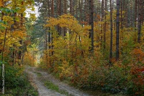 © butus, Obraz premium Песчаная дорога вдоль сосен и растительности с цветными листьями