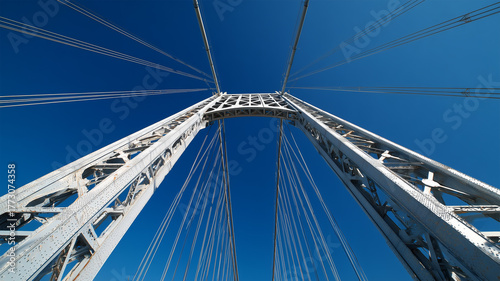 © bephoto, Fototapeta premium 重厚な鉄骨吊り橋支塔が真っ青な空に伸びる情景
