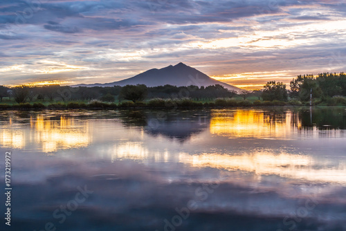 © Umibozze, Obraz premium 茨城県母子島遊水池の水面に映る朝焼けの筑波山