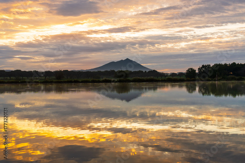 © Umibozze, Obraz premium 茨城県母子島遊水池の水面に映る朝焼けの筑波山
