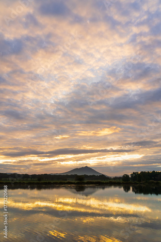 © Umibozze, Obraz premium 茨城県母子島遊水池の水面に映る朝焼けの筑波山