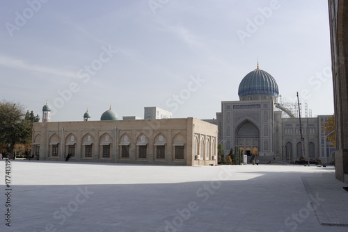 Naklejka premium ウズベキスタンの首都タシケントにあるティムール広場の銅像と博物館、及びコーラン博物館と近辺のイスラム建築。