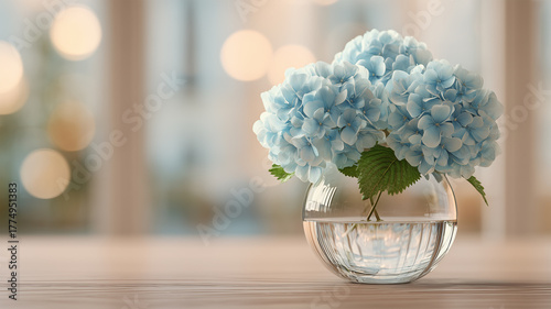© bephoto, Fototapeta premium 青いアジサイを活けた透明花瓶写真
