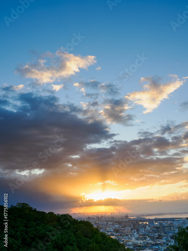 Obraz premium 都市の夜明け 神戸市の高台から市街地大阪湾を隔て大阪のビル群の景観