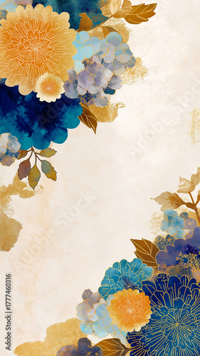 © 963k, Fototapeta premium 新年を彩る華やかな和柄デザイン背景・和風フレーム・伝統模様・金色装飾・筆タッチ・水彩テクスチャ・年賀・正月・縦構図素材