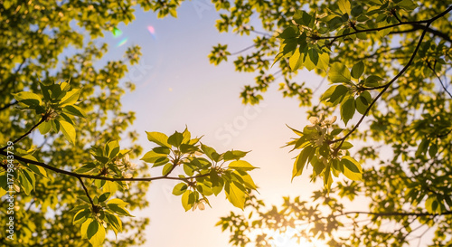 Obraz premium 朝のやわらかな光に包まれる春の樹冠、幻想感