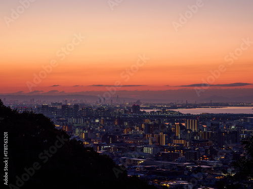 Naklejka premium 都市の夜明け 神戸市東灘区岡本の高台から市街地と大阪湾を隔て大阪市街地の景観