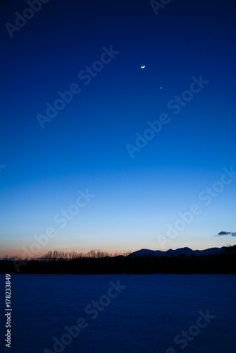 Obraz premium 雪原の上の月と金星(北海道・十勝)