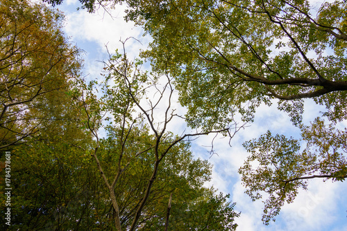 Obraz premium 木漏れ日に輝く色づいた木々の葉