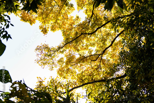 Obraz premium 木漏れ日に輝く色づいた木々の葉