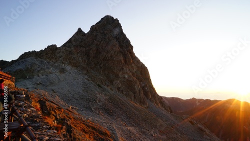 Fototapeta premium 北アルプス槍ヶ岳登山、朝の日差しを浴びる山荘