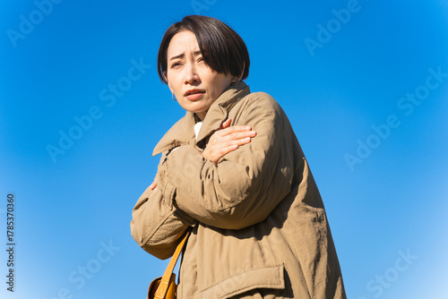 Fototapeta premium 冬空に凍える女性 ライフスタイルイメージ