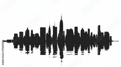 © 奈美 北橋, Naklejka premium 水面に反射する都市のスカイラインのシルエット。ミニマルな黒いベクターイラスト