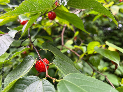 © PICCOLOGEOGRAPHIC, Fototapeta premium 初夏の森で真っ赤に実をつけたコウゾ。
