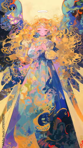 Obraz premium 心を癒すような穏やかな微笑みと、柔らかな色彩で描かれた神聖な天使の幻想イラスト|空想と祈りをテーマにした手描き風の美しい構図