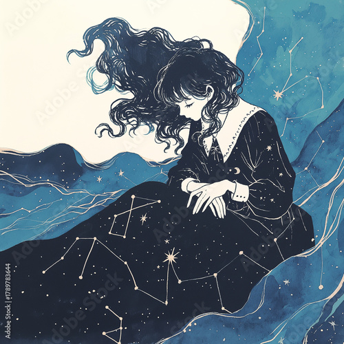 © 963k, Fototapeta premium 金色の星が舞う深い群青の背景に佇む、神秘的で儚げな女性の表情を描いた幻想的イラスト。夜、星、夢、宇宙をテーマにしたアナログ感あるアート。