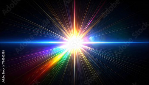 Fototapeta premium まばゆい白い光が虹色の光線となって広がる抽象アート。爆発的な輝きと放射状のエネルギーを表す背景