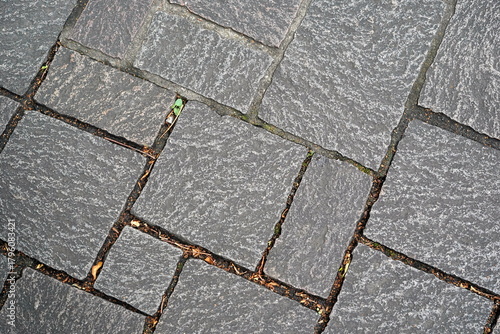 Obraz premium 表面にざらつきのある不揃いの形をした濃い灰色の石畳のクローズアップ写真で目地にはわずかに草や落ち葉が見えます。