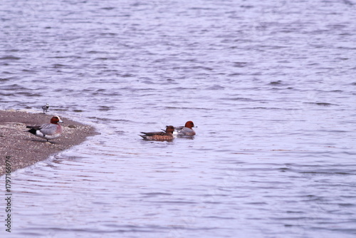 © eiiti aoki, Fototapeta premium 冬の川を優雅に泳ぐ鴨の群れ