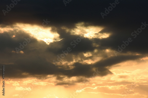 Obraz premium 空と雲「空想・雲のモンスター【黒い雲のところに顔(オレンジ色に染まったところが二つ目)】」(眼光が鋭い、鋭い眼差し、見つめる、目力などのイメージ)