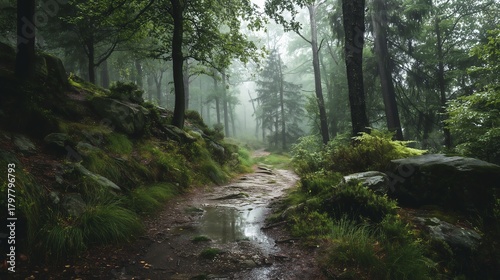 Obraz premium 雨上がりの森に漂う土の香り