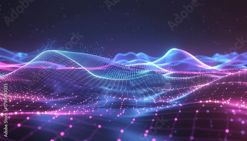 Obraz premium 輝くデジタル波が広がる未来景色