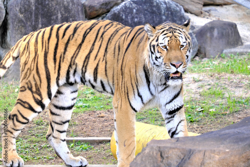 Naklejka premium トラ,虎,動物,動物園,野生動物,野生,自然,ネコ科,肉食動物,王者,猛獣,迫力,威厳,クローズアップ,顔,ポートレート,毛皮,模様,縞模様,オレンジ,黒...