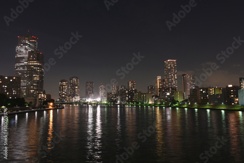 Fototapeta premium 日本の東京都市景観「勝鬨橋から見る月島などの高層マンションなど」(手前は墨田川)