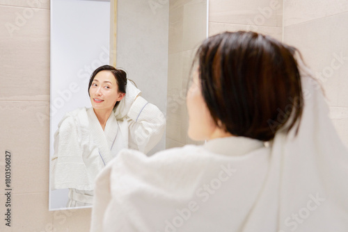 Fototapeta premium お風呂上がりに濡れている髪をバスタオルで拭く女性