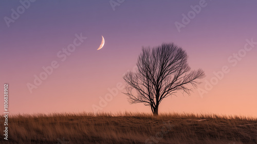 Fototapeta premium 月と枯れ木が静けさをつくる丘の景色