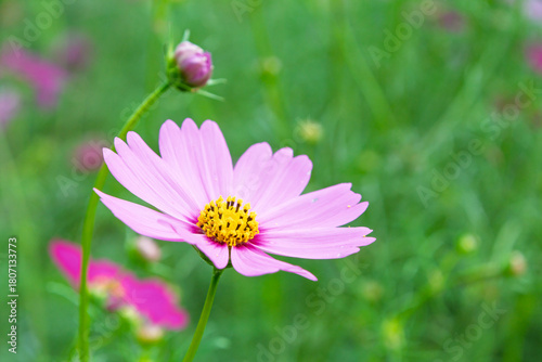 Fototapeta premium 秋風に揺れるピンクのコスモスと小さな蕾