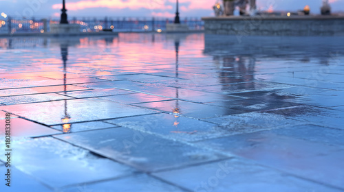 Obraz premium 雨上がりの石畳に映る夕焼けの反射