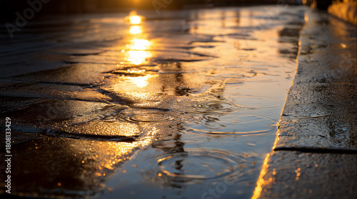 Obraz premium 雨上がりの石畳に映る夕焼けの反射