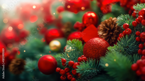 © Kuroneko Mac, Obraz premium 赤いオーナメントと実と松ぼっくりで飾られたクリスマスツリーの枝と輝く背景
