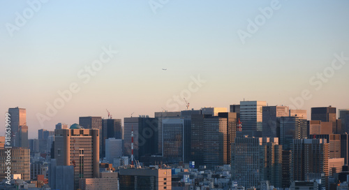Obraz premium 日本の東京都市景観・高層ビル群と飛行機(大手町などの高層ビル群などを望む)